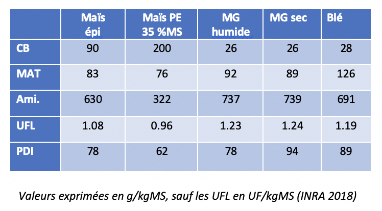Concernant sa composition chimique, le maïs épi est un mélange homogène de parois cellulosiques et d’amidon et il est rapidement dégradable par le rumen.Â