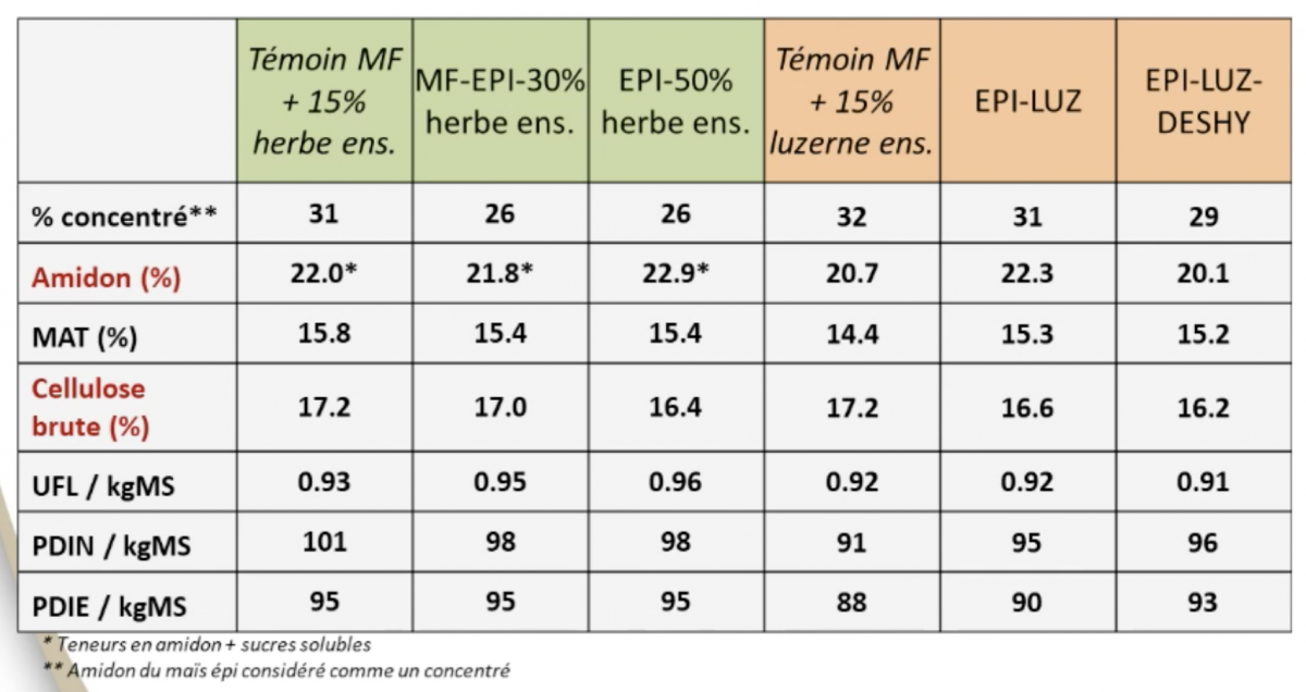 Dans l’essai ensilage de maïs épi – herbe ensilée, les essais ont été mené avec dix blocs de primipares avec une production de 27,7 kg lait/j et 7 blocs de multipares à 33,6 kg lait/j avec 155 jours de lactation en moyenne.Â