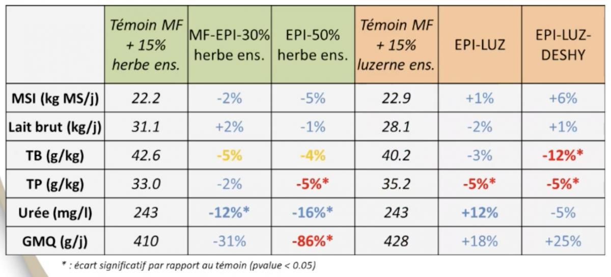 Dans l’essai ensilage de maïs épi – luzerne ensilée, les essais ont été mené avec 10 blocs de primipares avec une production de 24,4 kg lait/j et 9 blocs de multipares à 31,1 kg lait/j avec 210 jours de lactation en moyenne.Â