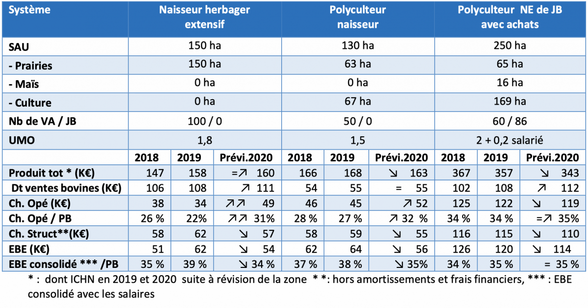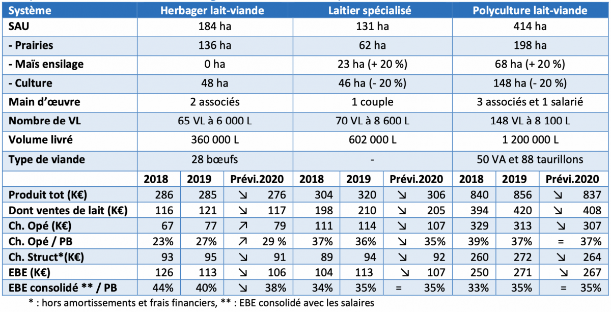 Avec tous ces paramètres et des indices de l’IPAMPA, Inosys Réseaux d’élevage Grand Est a mis au point ce tableau de prévisions économiques 2020 pour 3 systèmes laitiers en plaine.Â