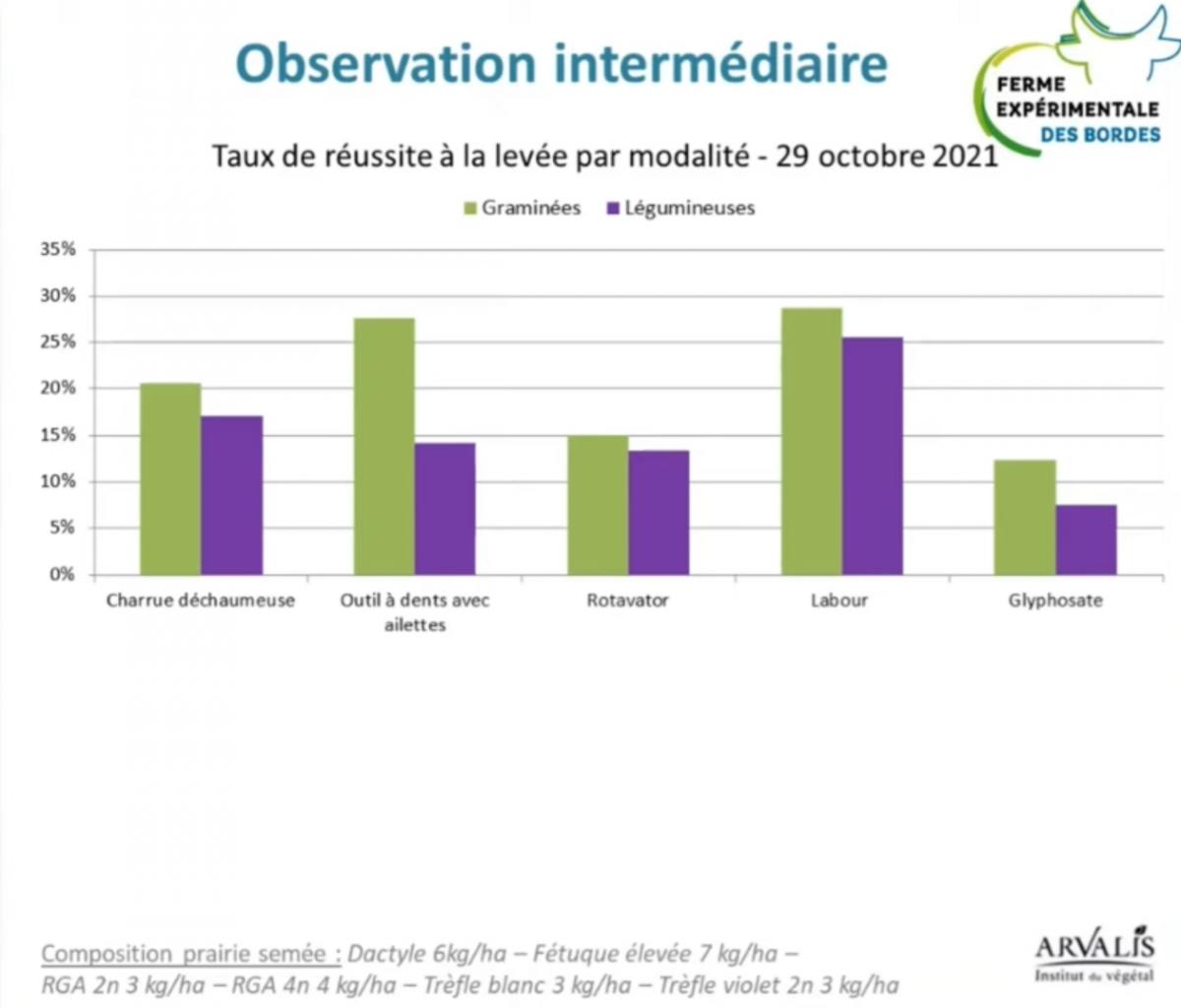 Concernant les taux de réussite à la levée, il en ressort une efficacité plutôt correcte de l’outil à dents en comparaison avec les modalités labour et glyphosate.