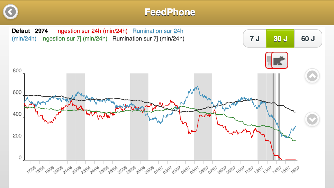 Pour cela, Médria a travaillé avec l’Inra de Rennes (UMR Pégase), à l’aide notamment d’expérimentations réalisées à la Ferme des Trinottières. L’objectif était de voir quelles variations de temps d’ingestion et de rumination entrainaient un effet significatif sur la production laitière ; la détection de variations pouvant se faire à l’échelle d’un animal ou d’un groupe d’animaux. Ainsi, FeedPhone compare les temps d’ingestion et de rumination des dernières 24h, à ceux des sept derniers jours en moyenne. Il est capable de différencier une alimentation à l’auge ou au pâturage.