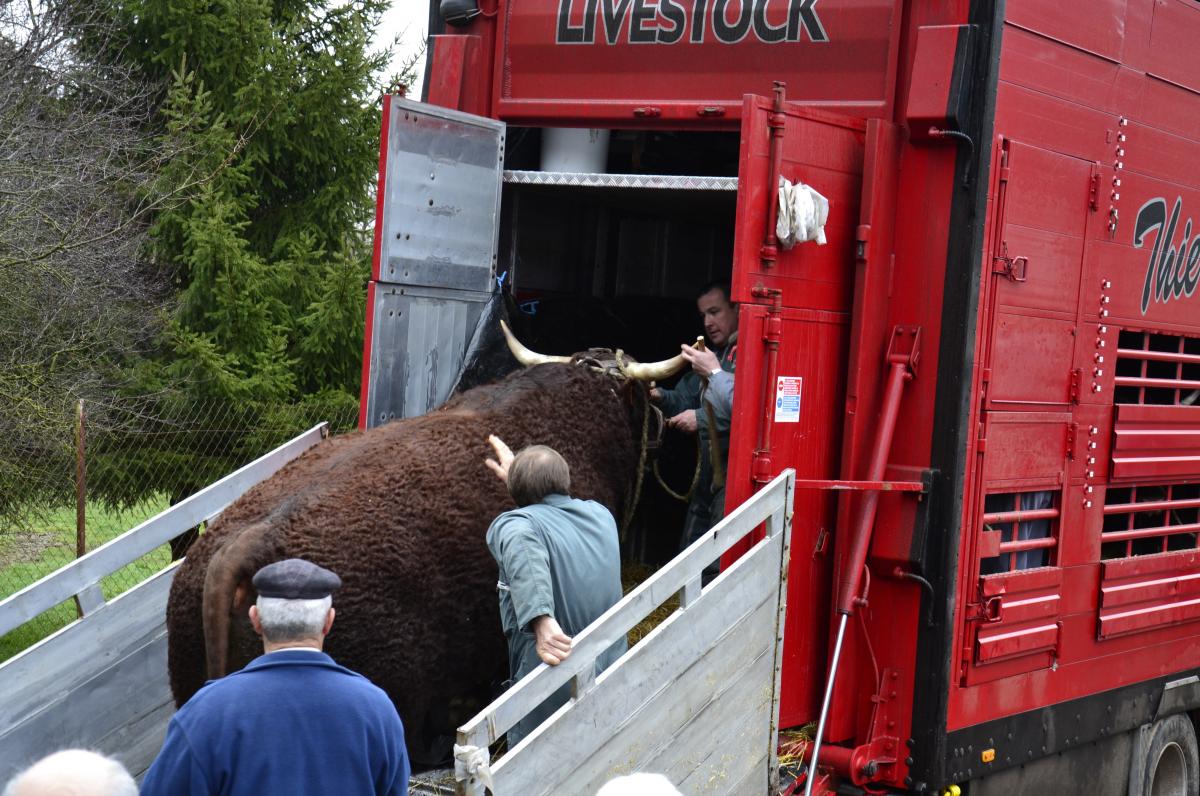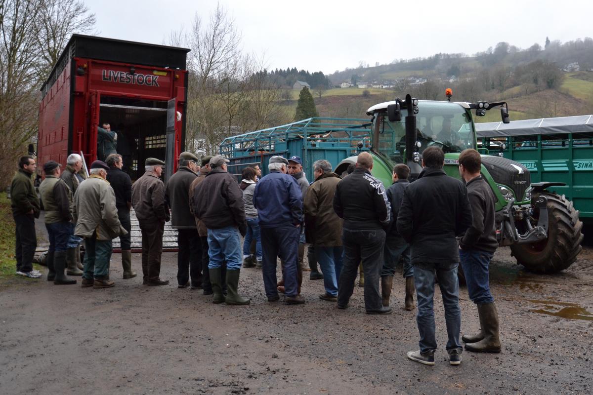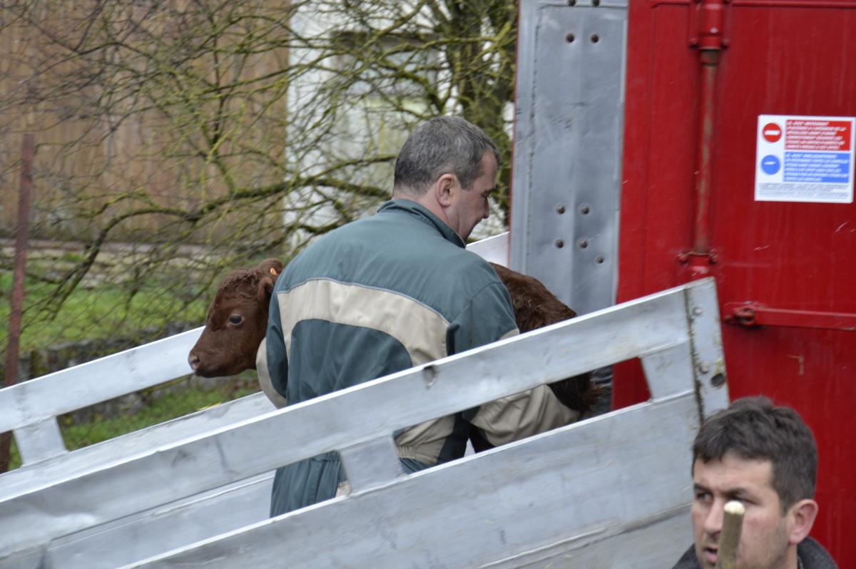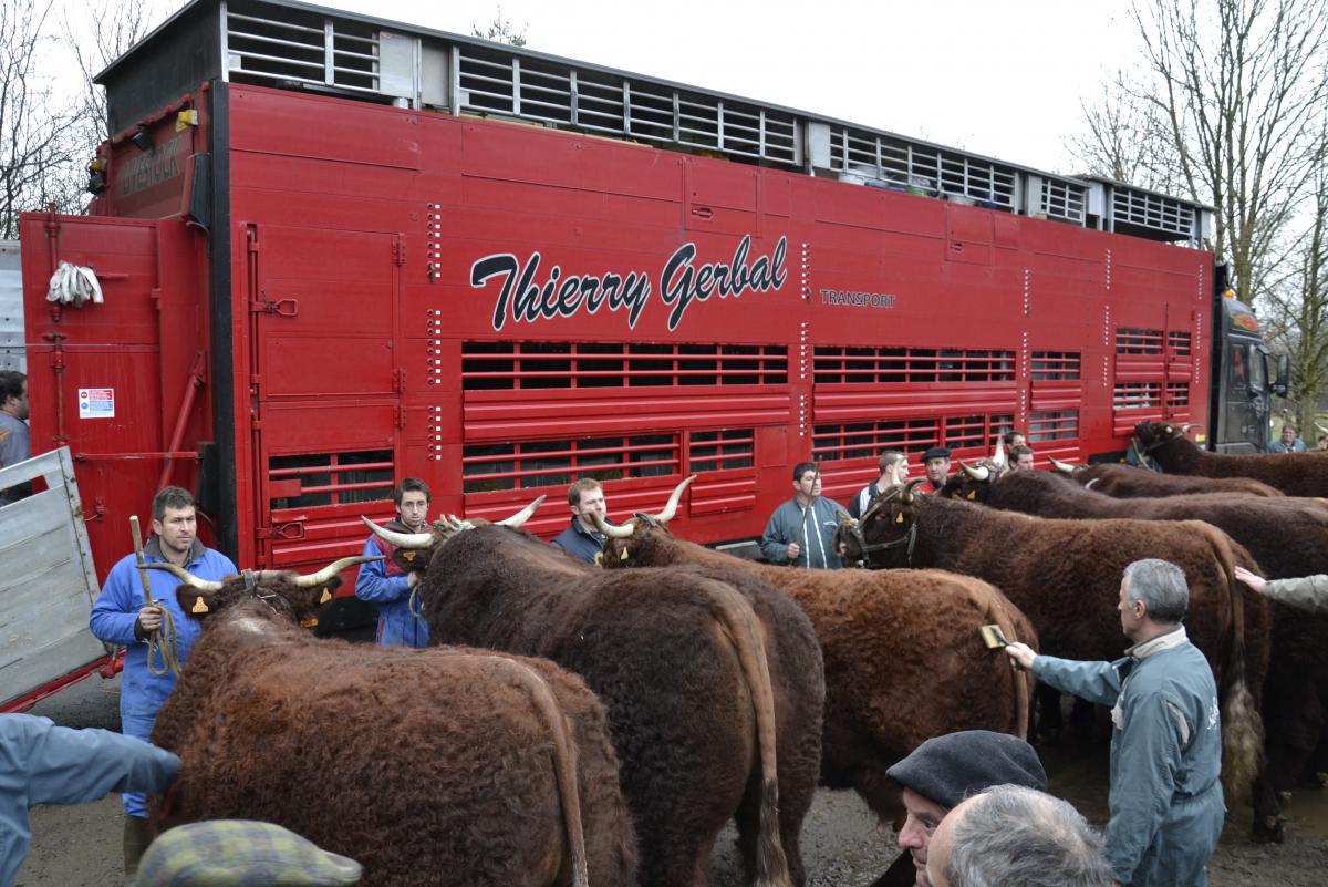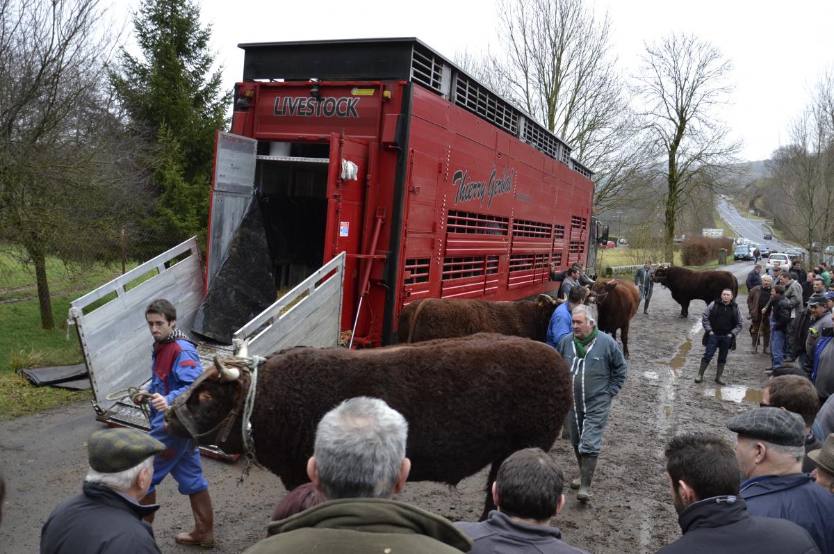 Une petite foule s'est rassemblée jeudi 20 février à 9h à Saint-Cernin (Cantal) à l'occasion du départ pour le Salon international de l'agriculture de dix vaches et taureaux salers.