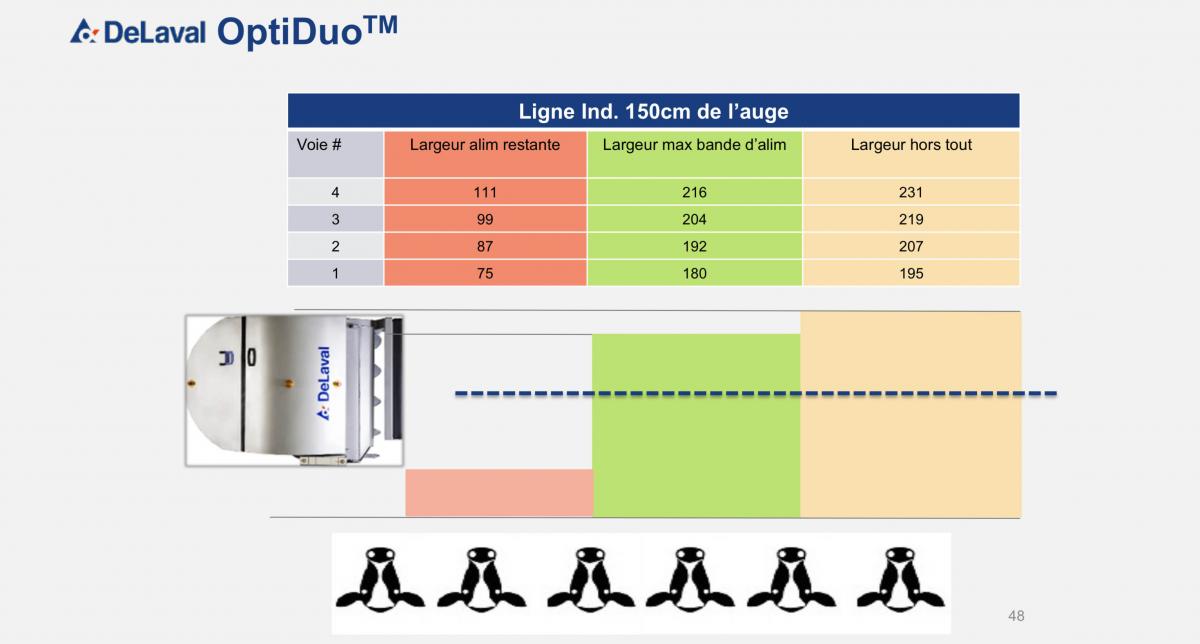 Le DeLaval OptiDuo a la possibilité́ de recevoir un distributeur de concentré de 90 l. Il gère automatiquement les différentes quantités et types de rations. Lorsqu’il a terminé son travail il retourne à sa station de charge. Le chargement se fait par deux contacteurs situés sur le dessus de la machine. Concernant l’aspect sécurité, l’OptiDuo est doté d’une trappe anti-bourrage et de contacteurs d’arrêt d’urgence placés autour de la machine.