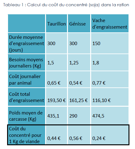 L’éleveur ne souhaite pas dépasser 5 ha de luzerne valorisée en foin. Dans l’objectif de substituer la luzerne au soja, les étudiants se sont intéressés à la part qu’occupe le soja dans le coût de la ration pour l'engraissement et la finition des animaux. Cette activité comprend des taurillons engraissés jusqu’à 18 mois et vendus en moyenne à 420 kg de carcasse, des génisses dont une partie est engraissée jusqu’à 220 voire 280 kg de carcasse, et enfin des vaches de réformes vendues généralement à 450 kg de carcasse.