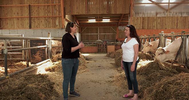 Côté nutrition, l'éleveuse indique que : "L'été, les vaches mangent de l'herbe en prairie. Puis, l'hiver, elle mange principalement du fourrage de trèfle, de la luzerne et du foin de pré. Elles sont également complémentées par des céréales avec du tourteau de colza en local et du tourteau de lin."