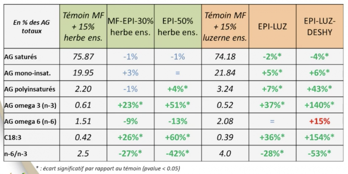 Les analyses des essais ont décrypté les impacts des différentes rations sur la composition fine du lait. Les acides gras sont significativement améliorés avec une part d’herbe élevée et encore plus avec la luzerne.Â