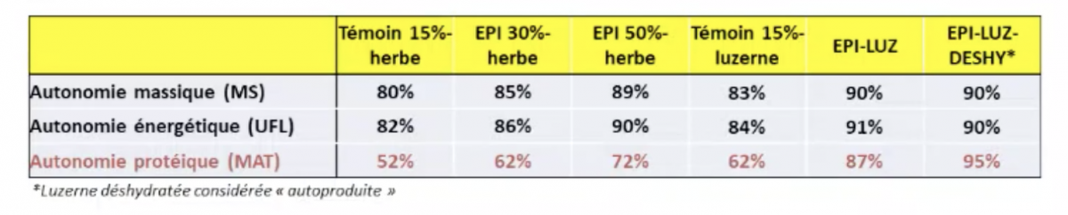En termes d’autonomie protéique, on remarque que la ration herbe (15%, 30%, 50%) – maïs épi divise par deux le correcteur azoté. La ration de base de luzerne avec un fourrage riche en protéine divise le correcteur azoté par trois et peut même le supprimer dans le cas de la luzerne déshydratée.