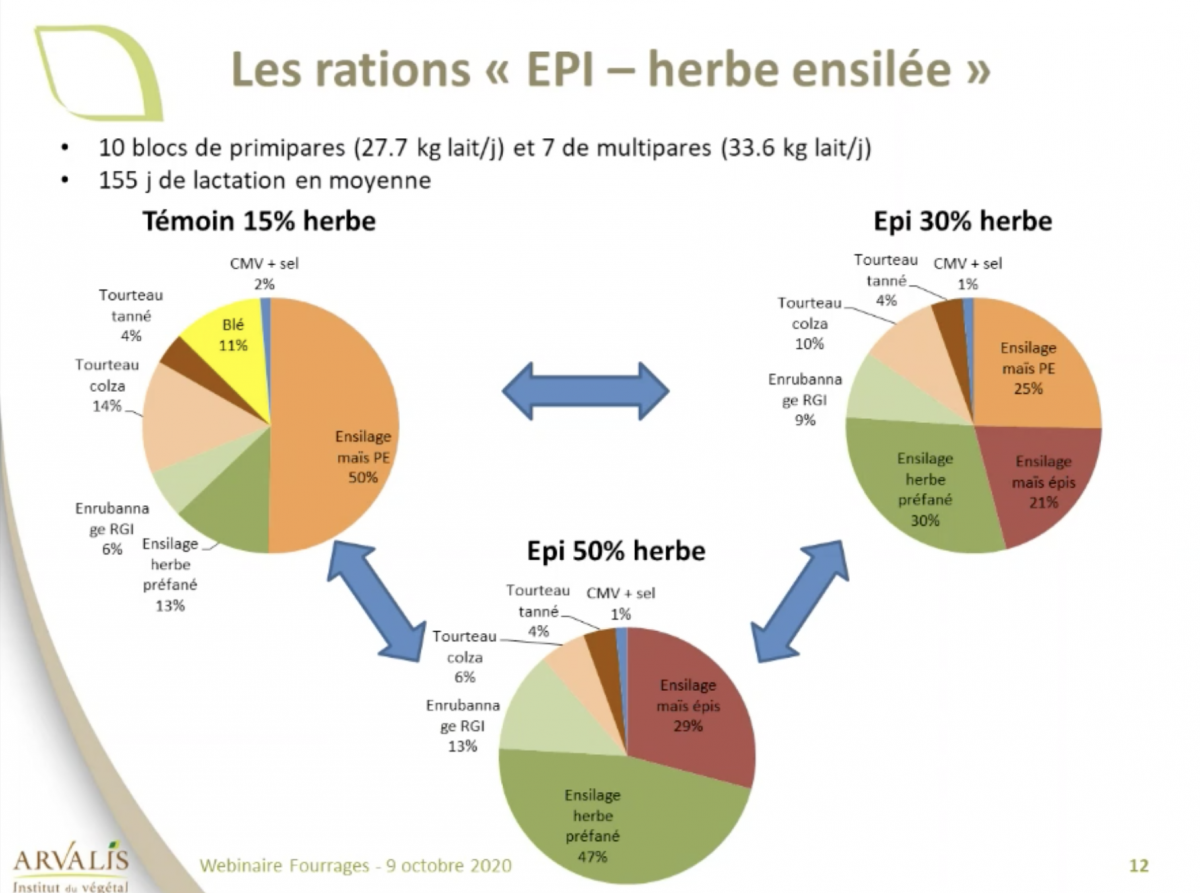Dans l’essai ensilage de maïs épi – herbe ensilée, les essais ont été mené avec dix blocs de primipares avec une production de 27,7 kg lait/j et 7 blocs de multipares à 33,6 kg lait/j avec 155 jours de lactation en moyenne.Â