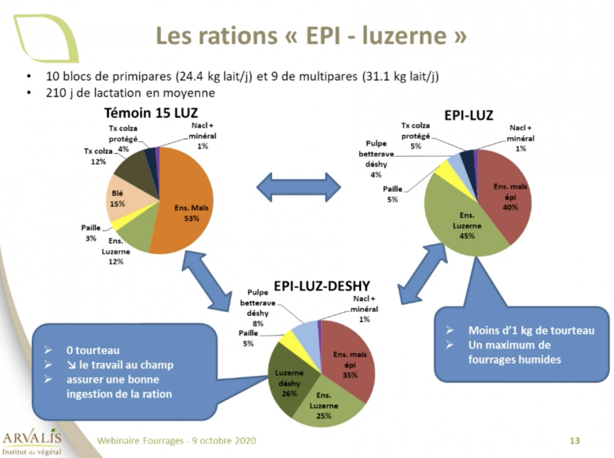 Pendant deux campagnes, en 2017-2018 et 2019-2020, la ferme expérimentale de la Jaillière a mis en place des essais pour comparer la complémentarité du maïs épi avec l’herbe et avec la luzerne. Dans les essais, l’herbe ensilée est un mélange de ray-grass Italien et anglais avec du trèfle blanc avec les valeurs suivantes : 41 % de MS, 0,99 UFL et 16,7 % de MAT. La luzerne ensilée est à 39 % de MS ; 0,84 UFL et 22,1 % de MAT.