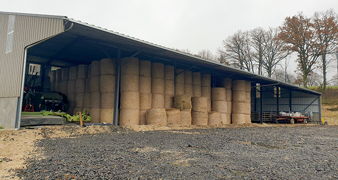 À court de capacité de stockage, Kevin et Jean-Marie Imbert ont décidé d'investir dans un hangar. Malheureusement, ils ont dû faire face à un retard de livraison. Le fourrage récolté au printemps n’a donc pas pu être abrité dans ce bâtiment, et c’est la stabulation qui a servi de stockage provisoire. Résultat, de la manutention supplémentaire pour les éleveurs au moment de tout rapatrier dans le nouveau bâtiment.