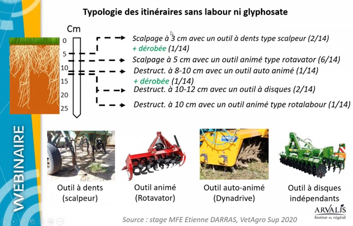 Concernant les typologies des itinéraires sans labour ni glyphosate qui ont été identifiées, il en ressort que cinq familles d’outils sont principalement utilisées par les éleveurs :