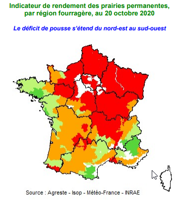 Le déficit de pousse de l'herbe, présent du nord-est au sud-ouest, concerne 77 % des régions fourragères. Il est particulièrement marqué dans les régions Grand-Est, Hauts-de-France et Bourgogne-Franche-Comté. Les pluies d’automne, insuffisantes ou trop tardives n’ont pas permis un redémarrage de la production. Ainsi, la pousse réalisée entre le 20 juin et le 20 octobre est très inférieure à celle de référence sur la quasi-totalité du territoire.