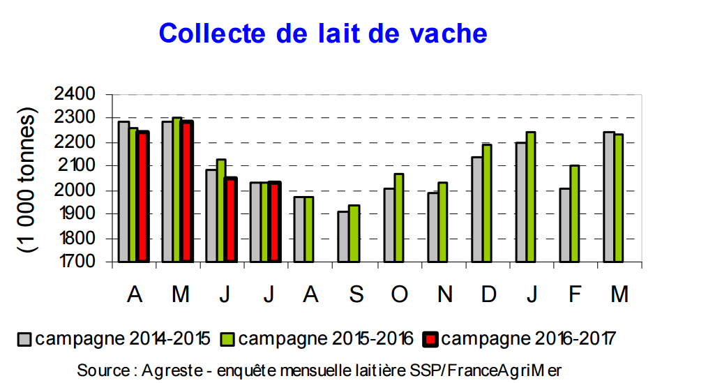 Après un recul de 3,7% en juin 2016 par rapport à juin 2015, la collecte de lait de vache se stabilise en juillet (+0,2%) par rapport à juillet 2015. Selon les sondages hebdomadaires de FranceAgriMer et l'analyse d'Agreste, la collecte laitière du mois d’août 2016 serait en net retrait par rapport à celle d’août 2015 en raison d’une pénurie d’herbe liée à la sécheresse estivale et non compensée par l’achat d’aliments composés dans un contexte de dégradation du prix du lait.