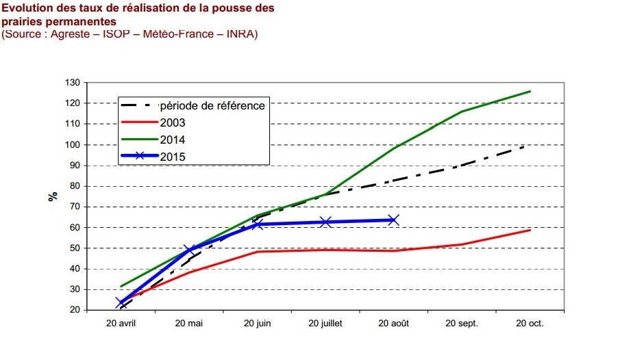 Au 20 août 2015, la production cumulée d'herbe est déficitaire dans la plupart des régions françaises: elle est estimée à un peu moins de 77% de la production de référence à la même date sur la période 1982-2009.
