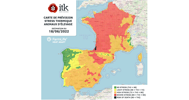 ITK predict and decide prévoit un risque de stress thermique pouvant aller jusqu'à la mort pour les animaux d'élevage, ce samedi 18 juin 2022.